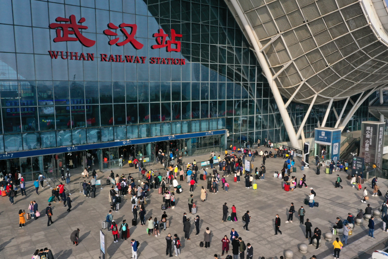 旅客在武漢火車站東廣場準備進站乘車(10月8日攝,無人機照片)。新華社發(趙軍攝)