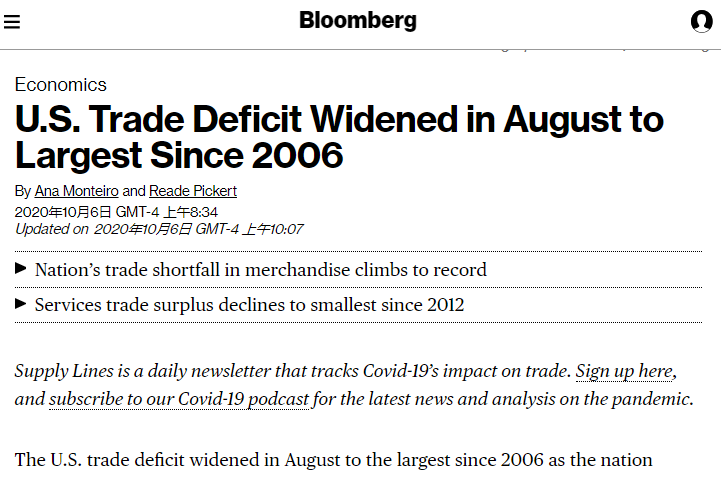 △彭博社報(bào)道:美國8月貿(mào)易逆差擴(kuò)大至2006年以來最高水平