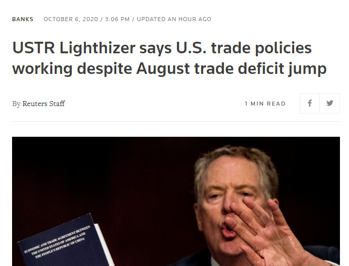 萊特希澤表示,美國8月貿(mào)易逆差擴(kuò)大是因?yàn)槊绹?jīng)濟(jì)復(fù)蘇快于它的貿(mào)易伙伴,自5月以來,美國的進(jìn)出口都出現(xiàn)反彈,但是進(jìn)口復(fù)蘇的速度更快。他認(rèn)為,美國今年的貿(mào)易逆差增加主要受到金條進(jìn)口的驅(qū)使,反映的是疫情期間交易員和投資者的風(fēng)險(xiǎn)對沖策略,而非經(jīng)濟(jì)基本面?傮w而言,盡管出現(xiàn)了新冠病毒,特朗普總統(tǒng)的貿(mào)易政策正在發(fā)揮作用。