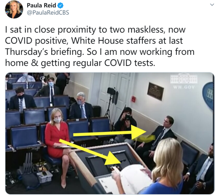 在得知麥肯尼確診后,CBS新聞記者保拉·里德(Paula Reid)默默地發了一條推文,稱自己在上周四(1日)的發布會上就坐在麥肯尼對面,且左手邊還有一名未戴口罩的工作人員。現在她已經主動在家隔離,并定期接受病毒檢測。
