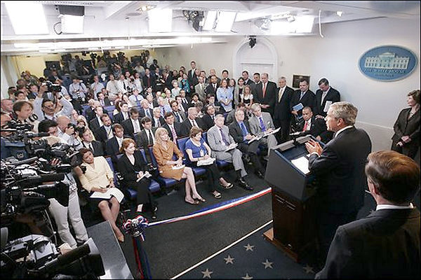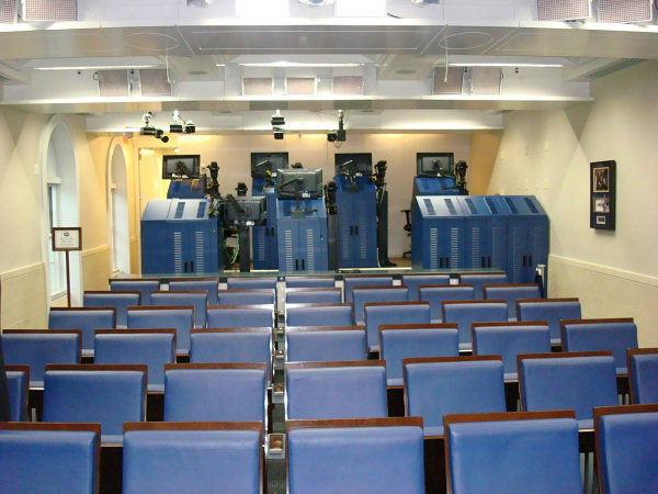 △狹窄擁擠的白宮新聞簡報室 資料圖片來自白宮博物館