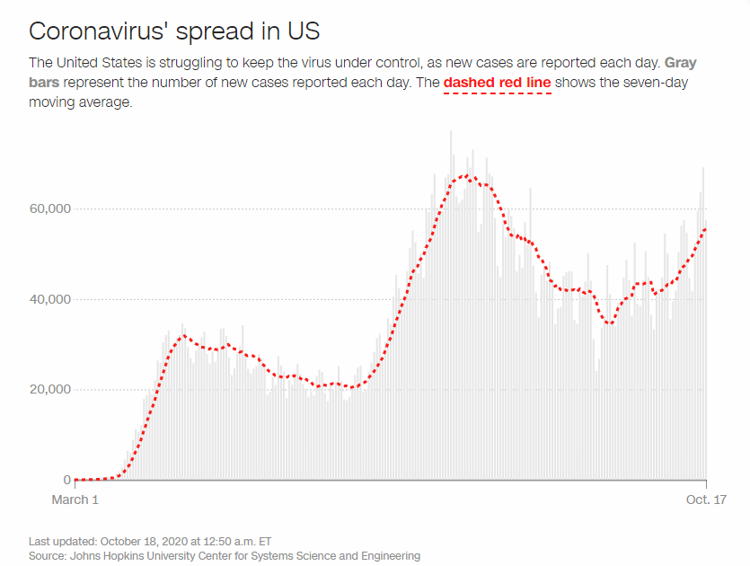 美國消費者新聞與商業(yè)頻道(CNBC)對約翰斯·霍普金斯大學收集的數(shù)據(jù)進行分析發(fā)現(xiàn),本周,美國平均每天新增約5.5萬例新冠肺炎確診病例,與一周前相比增加了16%以上,較9月中旬增加了60%以上。16日,包括科羅拉多、印第安納、明尼蘇達、北卡羅來納等在內(nèi)的10個州均報告了新冠疫情暴發(fā)以來的最高單日新增確診病例數(shù)。