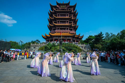 游客在武漢黃鶴樓景區(qū)觀看演出(10月1日攝)。新華社記者 肖藝九 攝