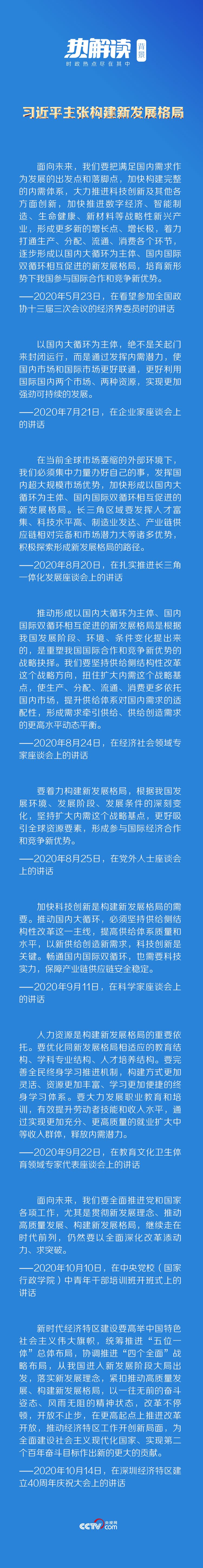 著眼我國發展階段、環境、條件變化,習近平總書記提出,要推動形成以國內大循環為主體、國內國際雙循環相互促進的新發展格局。在今年的一系列重要講話中,總書記也從不同角度對新發展格局作出深刻闡釋。
