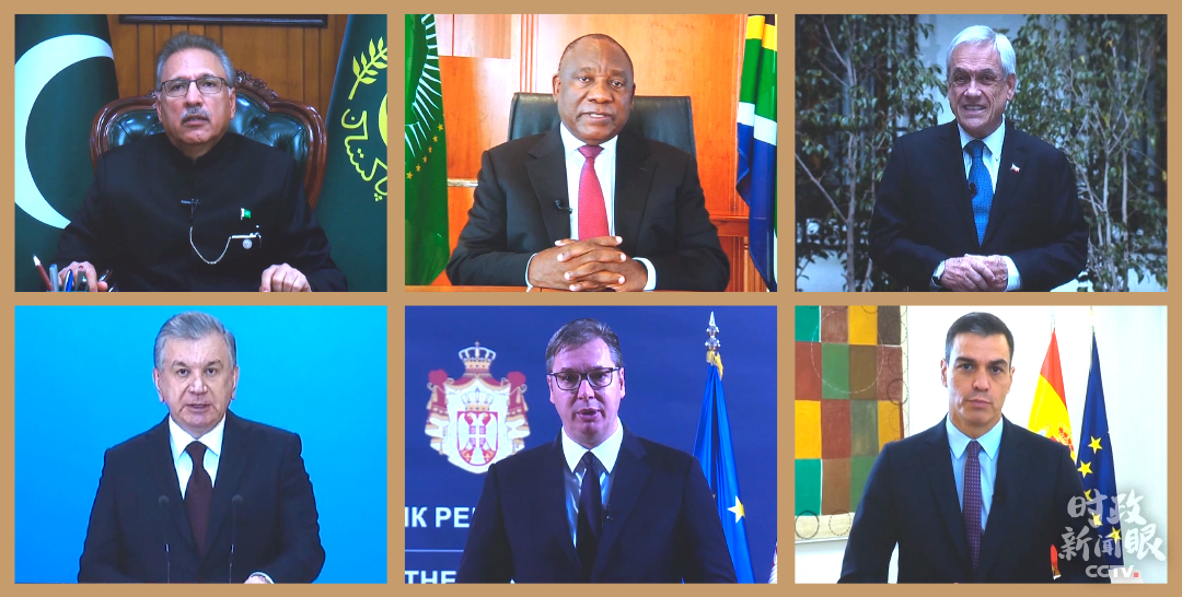 △開幕式現場,巴基斯坦總統阿爾維、南非總統拉馬福薩、智利總統皮涅拉、烏茲別克斯坦總統米爾濟約耶夫、塞爾維亞總統武契奇、西班牙首相桑切斯發表視頻致辭。