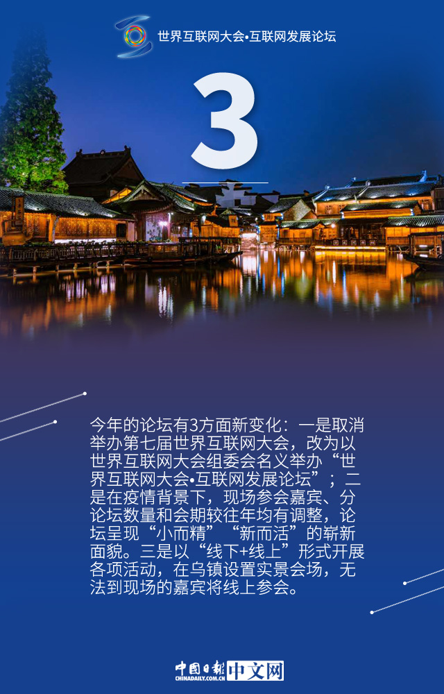 中國(guó)日?qǐng)?bào)網(wǎng)11月23日電 11月23日至24日,以“數(shù)字賦能 共創(chuàng)未來——攜手構(gòu)建網(wǎng)絡(luò)空間命運(yùn)共同體”為主題的“世界互聯(lián)網(wǎng)大會(huì)·互聯(lián)網(wǎng)發(fā)展論壇”將在浙江烏鎮(zhèn)舉辦。今年的論壇有哪些亮點(diǎn)以及不同之處,讓我們通過一組數(shù)字了解。