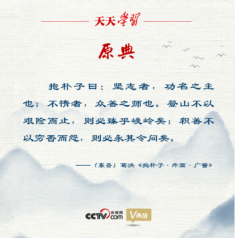 在《外篇·廣譬》中,葛洪提出:“堅志者,功名之主也;不惰者,眾善之師也。登山不以艱險而止,則必臻乎峻嶺矣;積善不以窮否而怨,則必永其令問矣。”意思是意志堅定,是建功立業(yè)的主導;勤奮不怠,是一切善行的老師。登山不因為艱難險阻而停止,就一定會到達頂峰;行善不因為自身窮困與否而埋怨,就一定會使自己的美譽長久。用登山作譬,指出意志堅定和勤奮不怠是事業(yè)成功的重要保證。