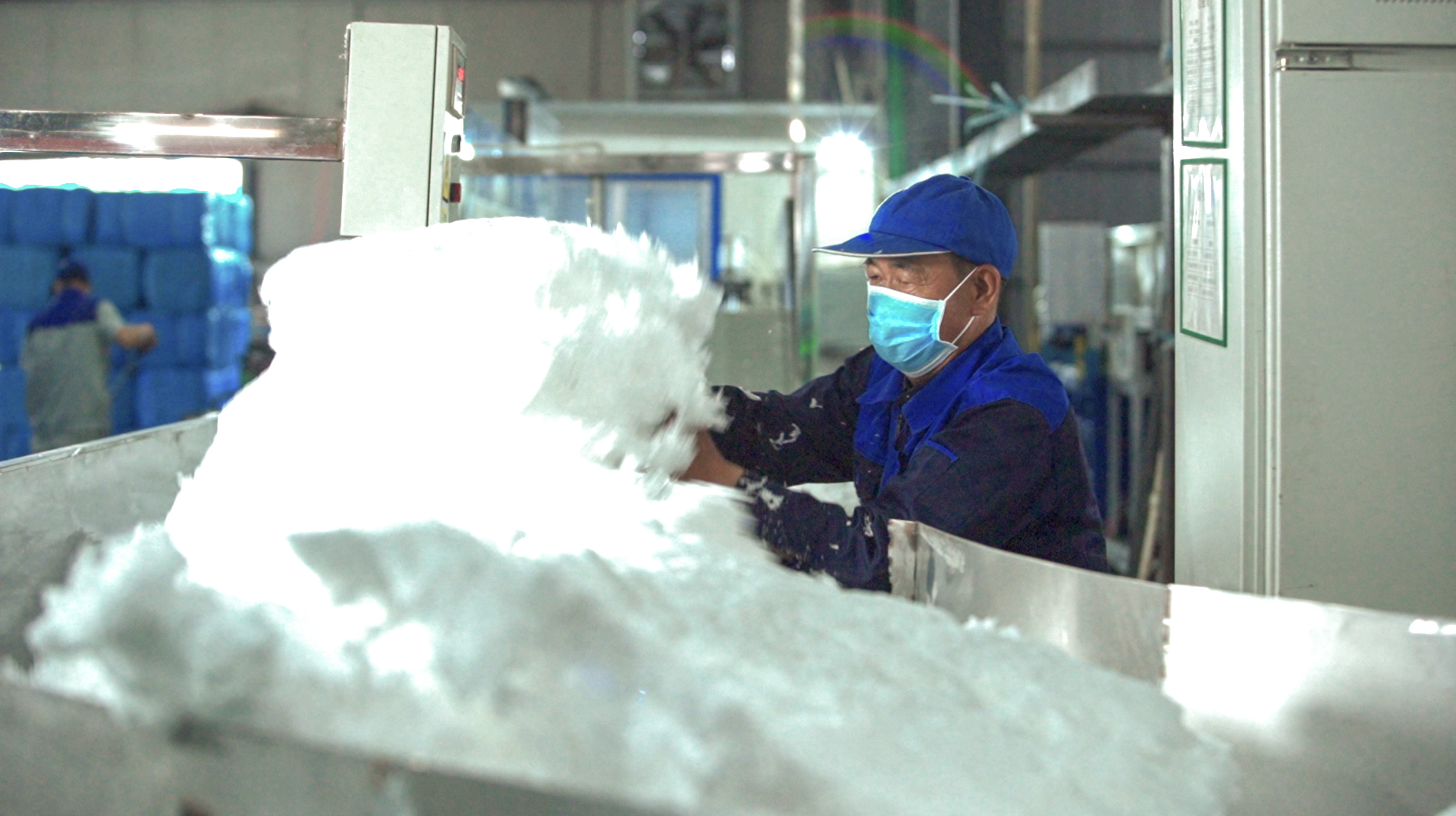 △曹六仁在玻棉廠生產線上忙碌著。