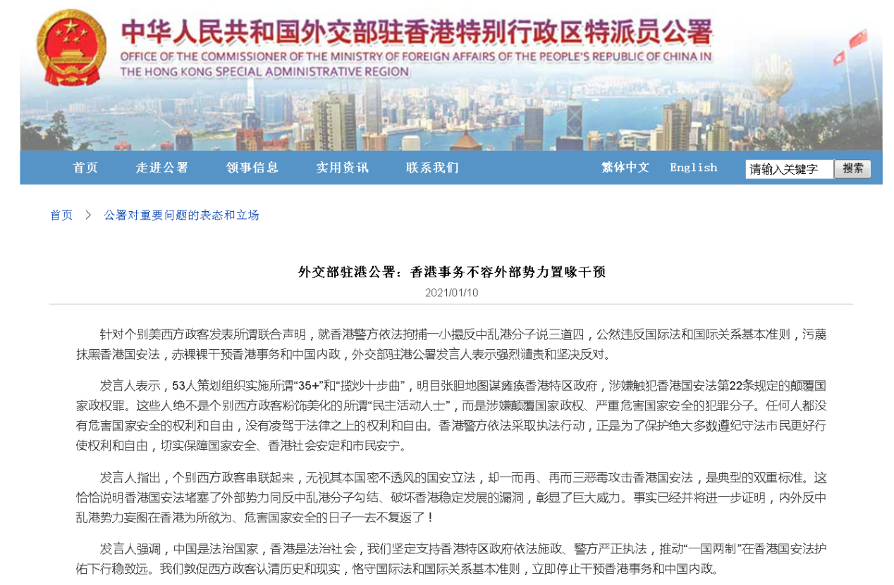 1月10日,針對個別美西方政客發表所謂聯合聲明,就香港警方依法拘捕一小撮反中亂港分子說三道四,公然違反國際法和國際關系基本準則,污蔑抹黑香港國安法,赤裸裸干預香港事務和中國內政,外交部駐港公署發言人表示強烈譴責和堅決反對。