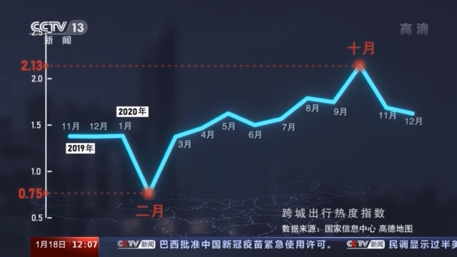國家信息中心根據用戶出行的位置變化信息,測算出了這張反映人們跨城出行熱度的曲線,經歷了2月的“低谷”,一路上揚,在10月,迎來最高點。