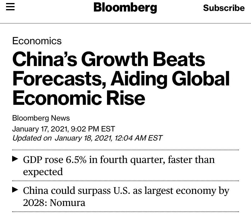 報道說,雖然全球其他主要經濟體經濟萎縮,但2020年第四季度中國經濟增速超過了疫情前的水平,中國經濟的全年增速也超過預期。