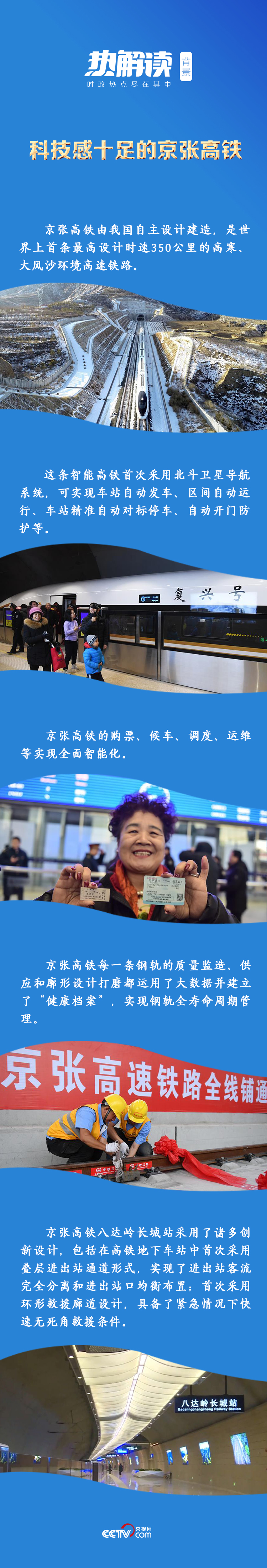 習近平總書記在對京張高鐵開通運營作出的重要指示中指出,從自主設計修建零的突破到世界最先進水平,從時速35公里到350公里,京張線見證了中國鐵路的發展,也見證了中國綜合國力的飛躍。