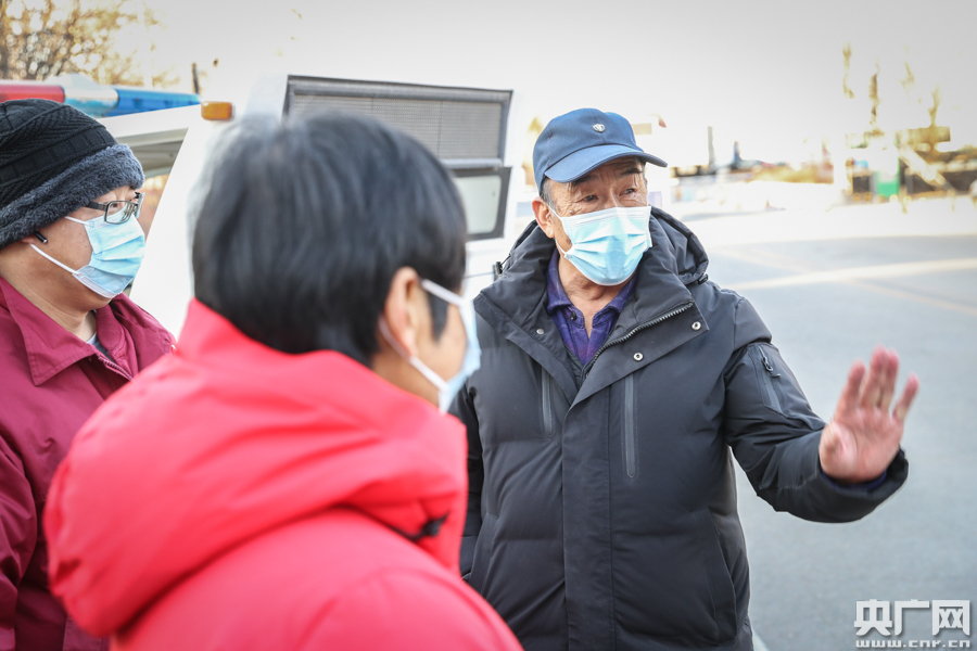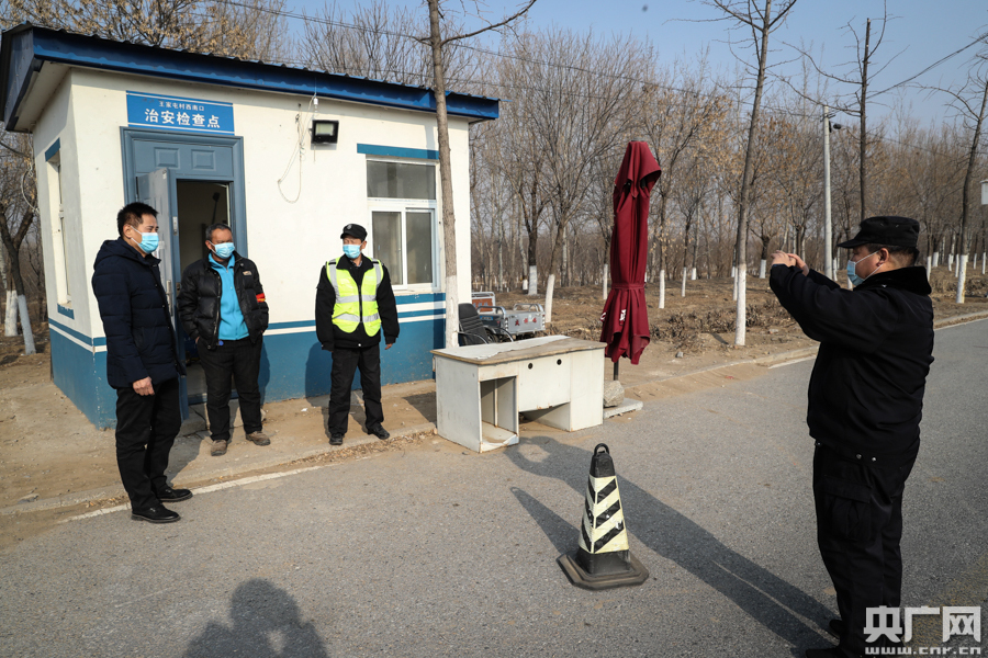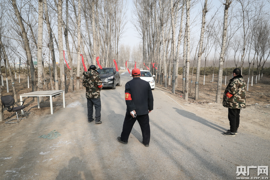 防疫人員楊福祿正在田家營村西南卡口執(zhí)勤(央廣網(wǎng)記者 韓靖 攝)