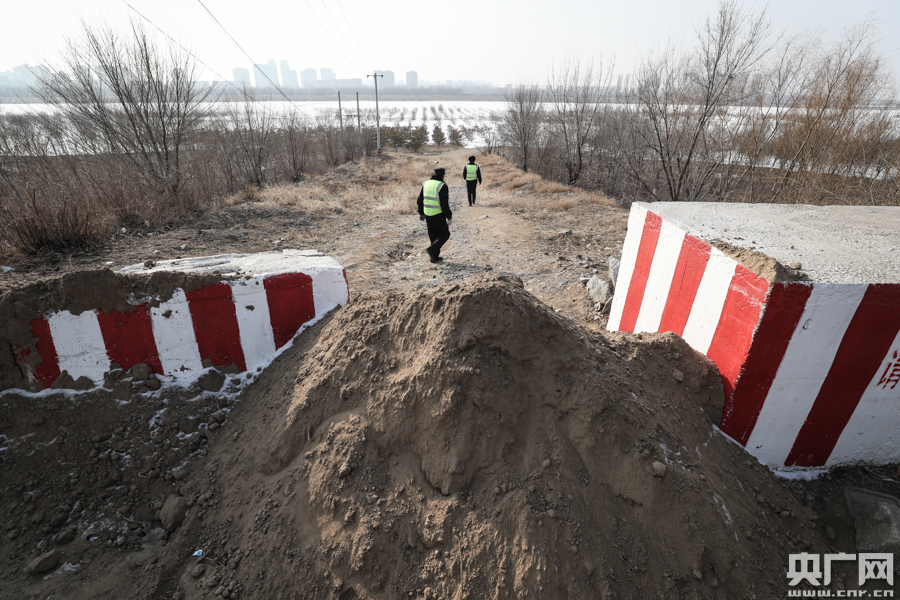 巡防人員正在河堤上執(zhí)勤,河對岸就是河北省廊坊市(央廣網(wǎng)記者 韓靖 攝)