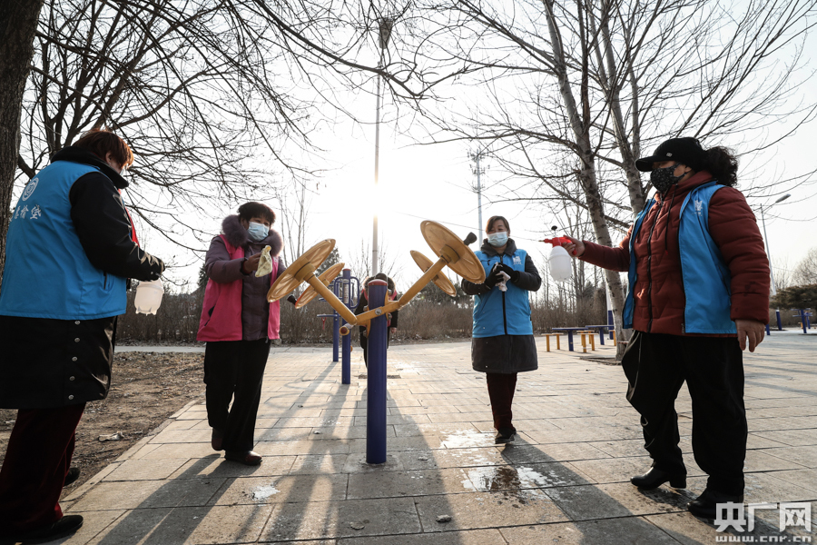 隊員們正在為健身器材消毒(央廣網(wǎng)記者 韓靖 攝)