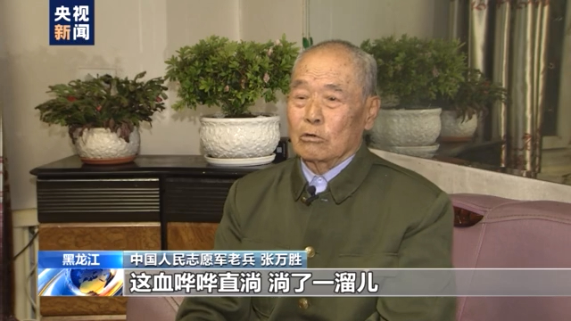 中國人民志愿軍老兵 張萬勝:(子彈)打我這兒,沒打著,打偏了就這樣,把鋼盔一下打掉了。我摸摸我的頭骨,這血嘩嘩直淌,淌了一溜兒。