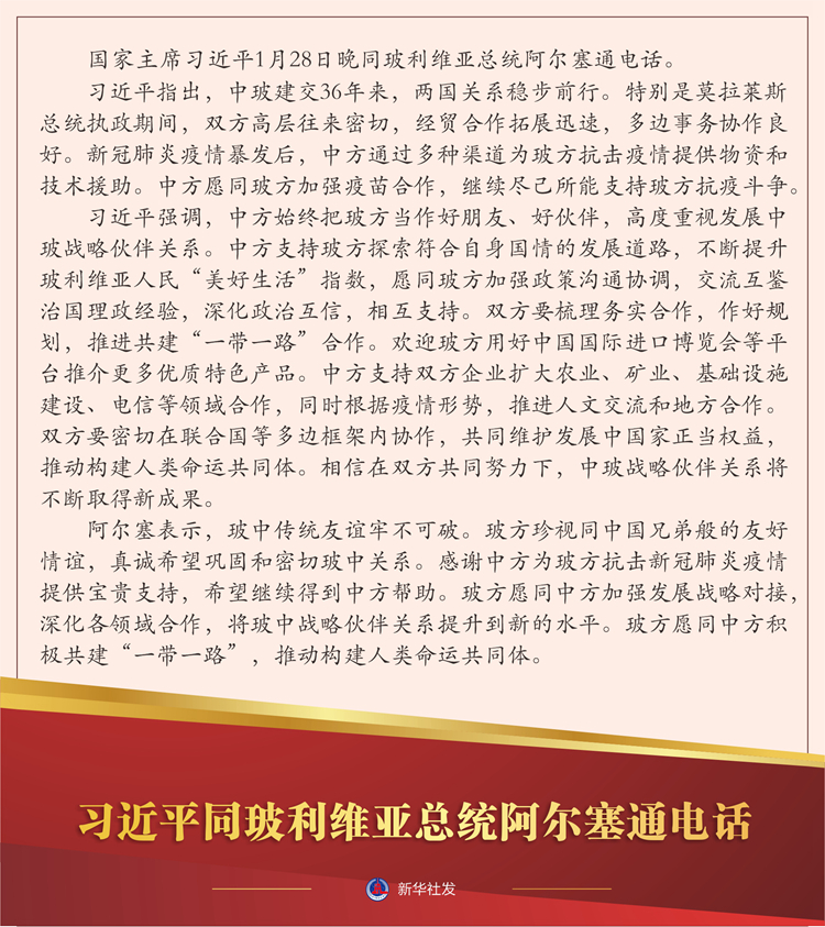 新華社北京1月28日電 國家主席習近平1月28日晚同玻利維亞總統阿爾塞通電話。