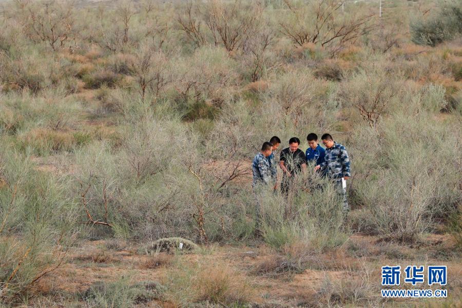 空軍某運輸搜救團一大隊官兵和地方林業(yè)人員在內(nèi)蒙古阿拉善左旗“1992年播區(qū)”察看植物生長情況(2020年6月8日攝)。新華社發(fā)(劉暢 攝)
