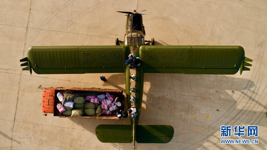 空軍某運輸搜救團官兵與當?shù)厝罕娒芮信浜涎b載種子(2020年6月7日攝)。)新華社發(fā)(丁少軒 攝)