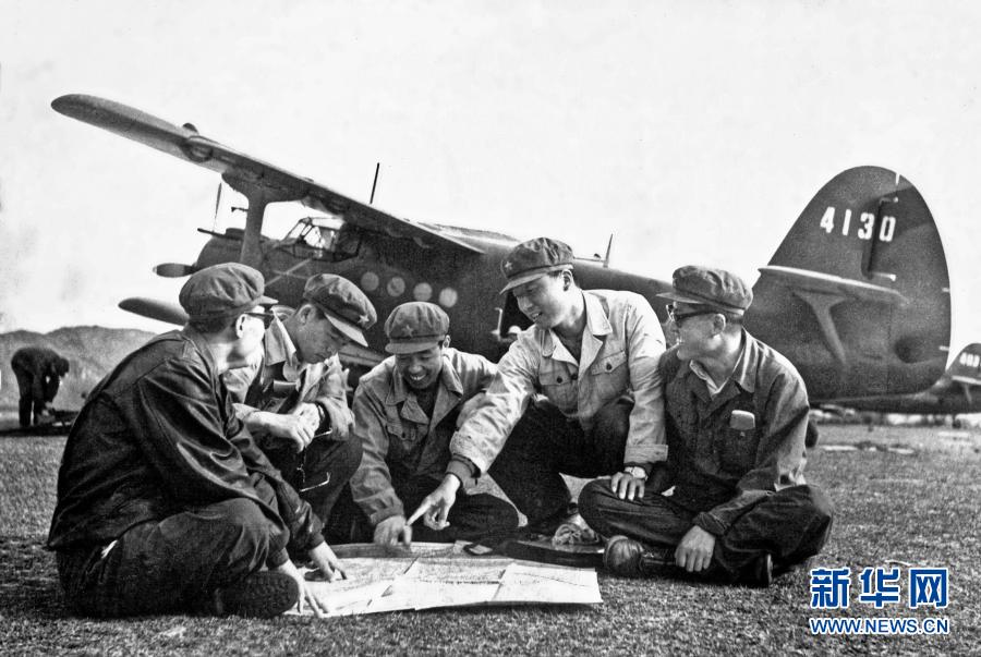 1983年4月,第一代“飛播人”、時任空軍某團一大隊大隊長宋占清(右二)率領(lǐng)一大隊多個機組進駐陜西漢中執(zhí)行飛播造林任務(wù)(資料照片)。新華社發(fā)