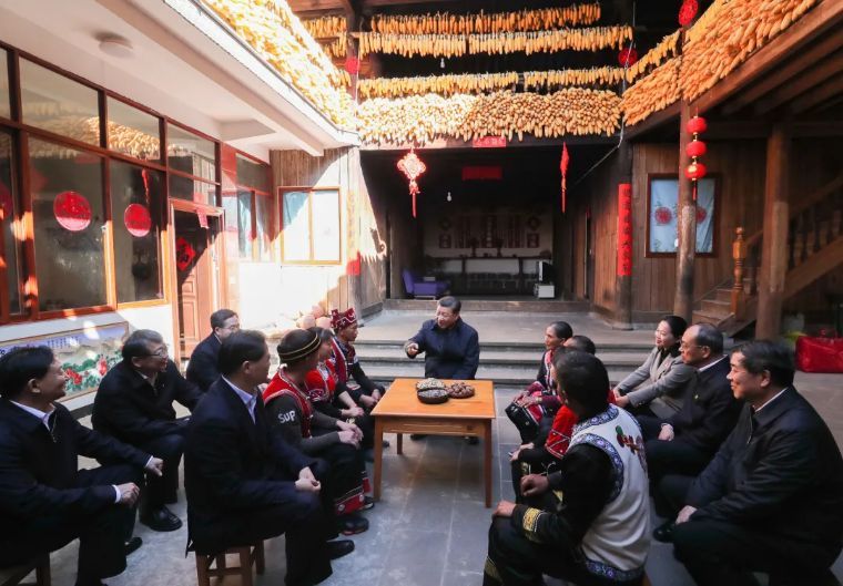 ↑2018年2月12日,習近平在四川成都市郫都區戰旗村考察時同村民們親切交流。