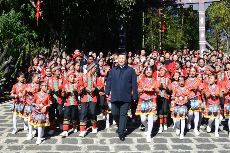 ↑2020年1月19日,云南騰沖市清水鄉三家村中寨司莫拉佤族村的鄉親們唱著《阿佤人民唱新歌》,簇擁著習近平走出村口。