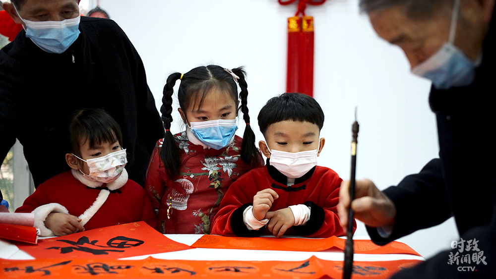 △金元社區居民活動室內,孩子們觀摩書法寫作。(總臺央視記者王哈男拍攝)