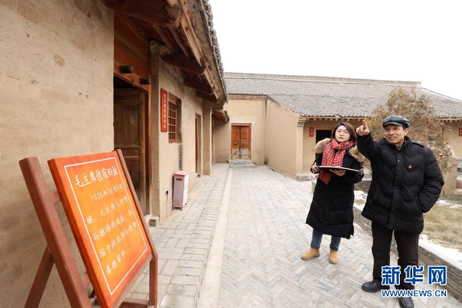 單家集單南村黨支部書記單云(右)介紹毛主席帶領中央紅軍途經單家集的歷史(1月29日攝)。新華社記者 盧鷹 攝