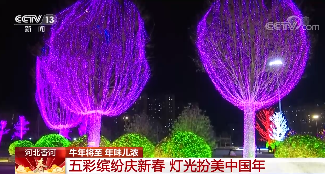 在河北廊坊市香河縣,城區(qū)亮化景觀和節(jié)日彩燈全部點(diǎn)亮。新城公園、五一公園等重要節(jié)點(diǎn)的亮化光源裝飾一新,街道兩側(cè)的行道樹(shù)上纏繞著五彩繽紛的線燈,營(yíng)造出錯(cuò)落有序、層次鮮明的亮麗夜景。街道兩側(cè)一串串火紅的燈籠,烘托出濃濃的年味。