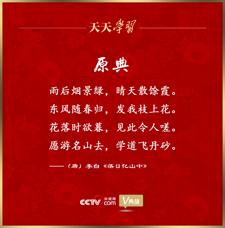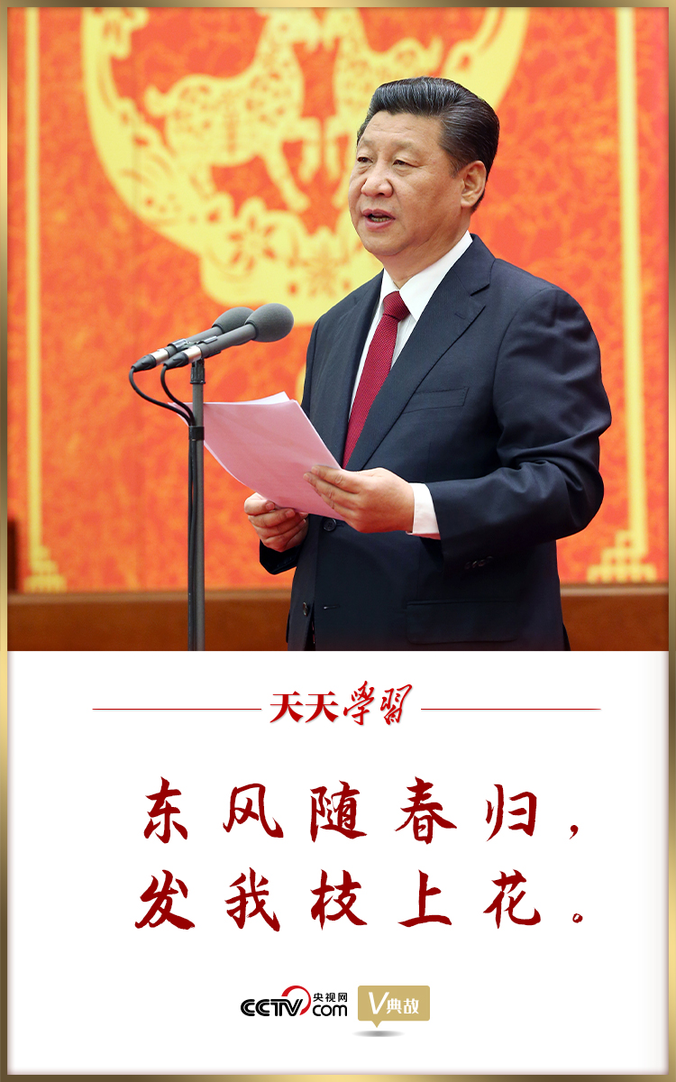 在2015年春節(jié)團(tuán)拜會(huì)上的講話中,習(xí)近平總書記開場(chǎng)便引用了李白的“東風(fēng)隨春歸,發(fā)我枝上花”,為我們展現(xiàn)了一幅亮麗動(dòng)人的春景圖,一股意氣風(fēng)發(fā)的豪邁之氣油然而生。春華今正濃,秋實(shí)自可期!按禾觳シN,秋天收獲。讓我們踏著春天的腳步,把人民對(duì)美好生活的向往作為奮斗目標(biāo),扎扎實(shí)實(shí)干好各項(xiàng)工作,共同創(chuàng)造祖國(guó)的美好未來!痹谥v話結(jié)尾,習(xí)近平總書記發(fā)出了動(dòng)員令,宣示了黨中央團(tuán)結(jié)帶領(lǐng)人民創(chuàng)造新輝煌的堅(jiān)定信心,也表達(dá)了全體中華兒女奔向偉大夢(mèng)想的共同期盼!