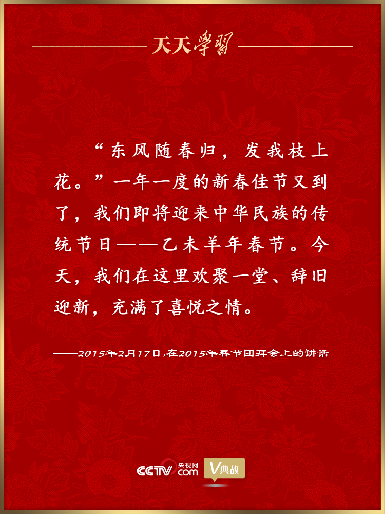 黨的十八大以來,習(xí)近平總書記多次在臘月二十九舉行的春節(jié)團(tuán)拜會(huì)上發(fā)表重要講話,盤點(diǎn)舊歲、謀劃新年,向全國(guó)各族人民、港澳臺(tái)同胞和海外僑胞拜年,并致以美好的新春祝福。在講話中,習(xí)近平總書記頻頻引用具有新春節(jié)令特點(diǎn)的古代經(jīng)典詩(shī)文名句抒發(fā)情懷、暢想未來。這些詩(shī)文名句如春風(fēng)化雨潤(rùn)人心田、暖人心扉,激勵(lì)著億萬人民在新的一年里追夢(mèng)前行。