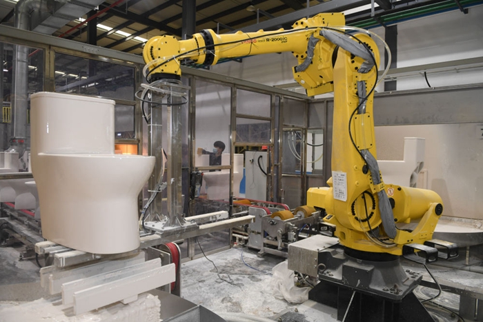 1月13日,智能機器人在福建省首家5G智慧陶瓷工廠生產潔具。新華社記者 宋為偉 攝