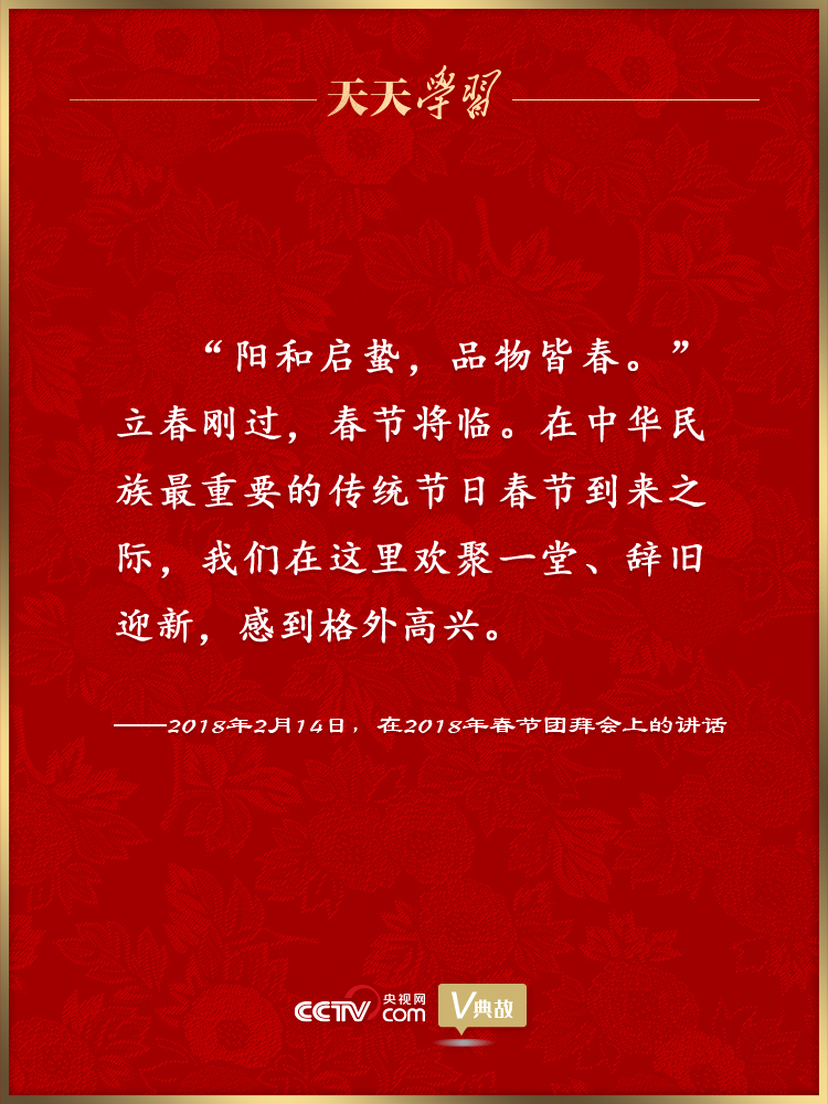 黨的十八大以來,習(xí)近平總書記多次在臘月二十九舉行的春節(jié)團(tuán)拜會(huì)上發(fā)表重要講話,盤點(diǎn)舊歲、謀劃新年,向全國(guó)各族人民、港澳臺(tái)同胞和海外僑胞拜年,并致以美好的新春祝福。在講話中,習(xí)近平總書記頻頻引用具有新春節(jié)令特點(diǎn)的古代經(jīng)典詩(shī)文名句抒發(fā)情懷、暢想未來。這些詩(shī)文名句如春風(fēng)化雨潤(rùn)人心田、暖人心扉,激勵(lì)著億萬人民在新的一年里追夢(mèng)前行。