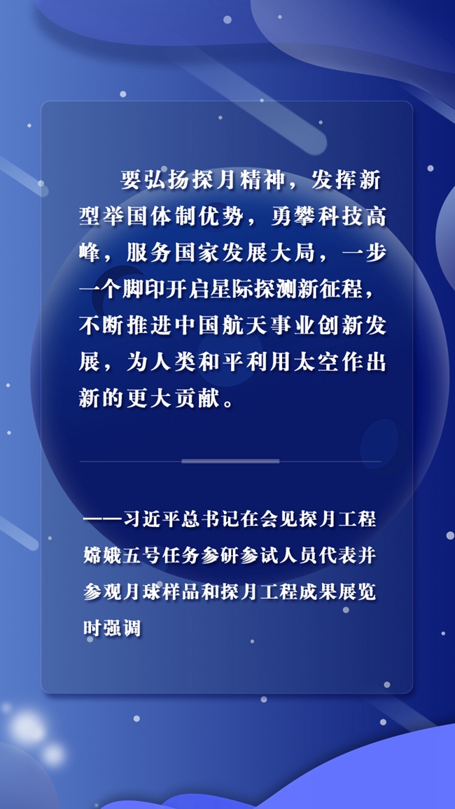 近日,在會見探月工程嫦娥五號任務參研參試人員代表并參觀月球樣品和探月工程成果展覽時,習近平總書記充分肯定探月工程特別是嫦娥五號任務取得的成就,對航天工作者弘揚探月精神,開啟星際探測新征程寄予殷殷期望。