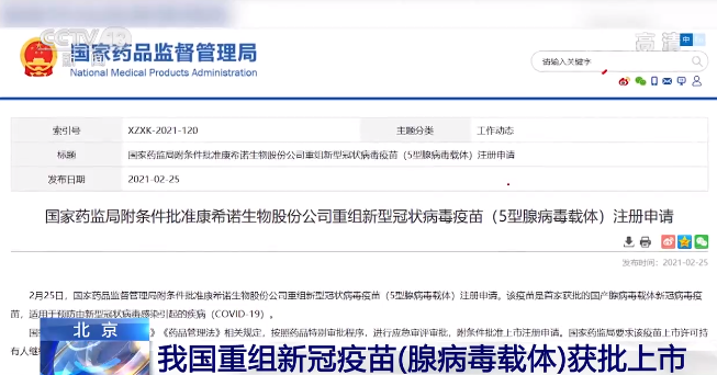 25日,國家藥監(jiān)局根據(jù)《疫苗管理法》和《藥品管理法》的相關(guān)規(guī)定,按照藥品特別審批程序,進行應急審評審批,附條件批準了重組新冠疫苗(腺病毒載體)的上市注冊申請,并要求上市許可持有人繼續(xù)開展相關(guān)研究工作,完成附條件的要求,及時提交后續(xù)研究結(jié)果。