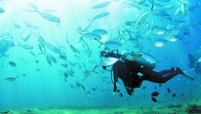 春節(jié)期間,在海南三亞蜈支洲島海域,游客在體驗潛水。新華社發(fā)