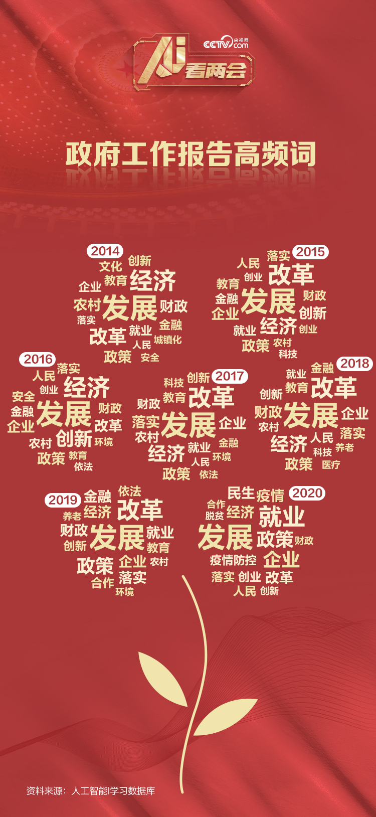 依托人工智能I學習數據庫,央視網人工智能編輯部還分析了2014年以來每一份政府工作報告的高頻詞。