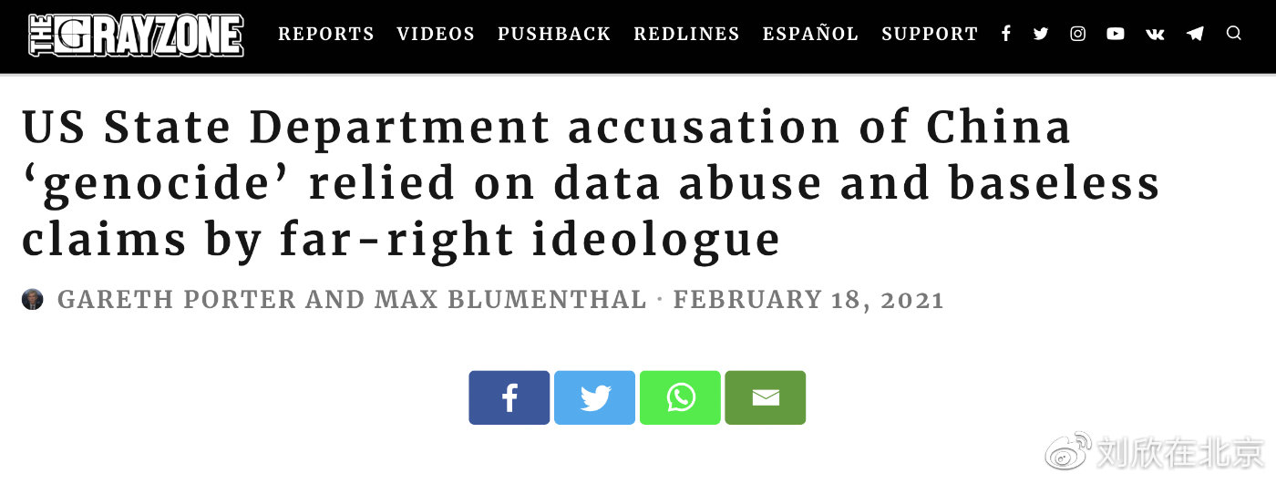 2021年2月18日,美國獨立網站“灰色地帶(The Grayzone)”發表報告,題為《美國國務院對中國“種族滅絕”的指控基于數據濫用和極右翼分子毫無根據的斷言》。報告駁斥了德國人鄭國恩對中國“種族滅絕”的指控,稱鄭國恩為“右翼宗教極端分子”,其相關研究是公然的數據濫用和捏造。24日,該網站主編馬克斯·布盧門撒爾(Max Blumenthal)接受了CGTN主持人劉欣的獨家專訪。他告訴劉欣,通過“法醫式”地剖析鄭國恩的“報告”,可以發現他的結論不堪一擊,甚至可笑至極。然而,這些煽動性的“結論”卻被美西方政府、議員、主流媒體大肆引用,為什么?這種政治操弄目的何在,會帶來什么惡果?