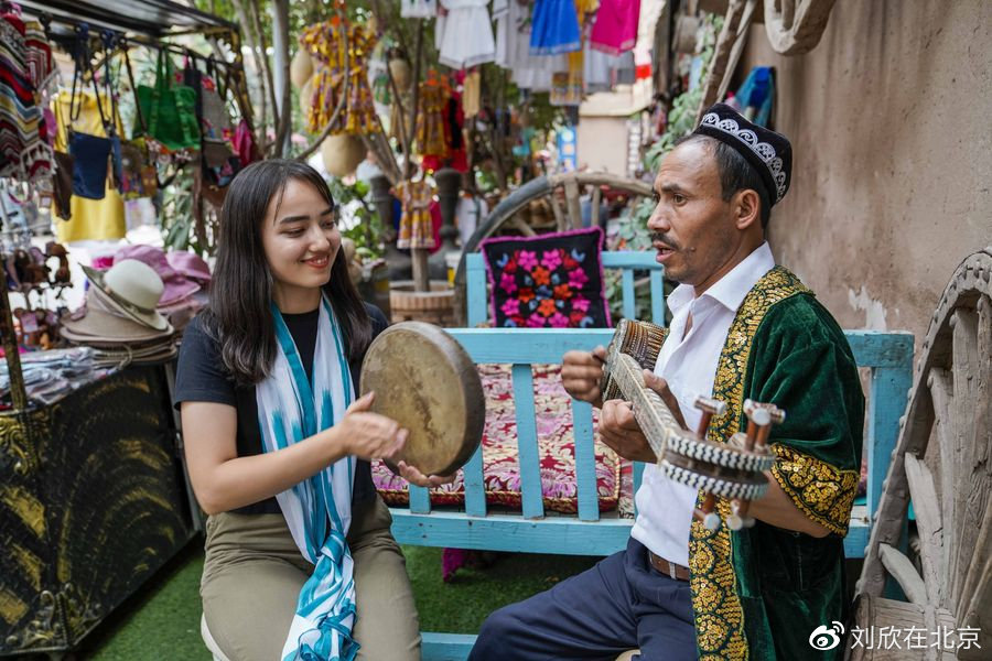 △在喀什古城景區阿熱亞路“古麗的家”特色庭院里,當地居民演奏樂器吸引游客到來(2019年7月9日攝)。新華社記者 趙戈 攝