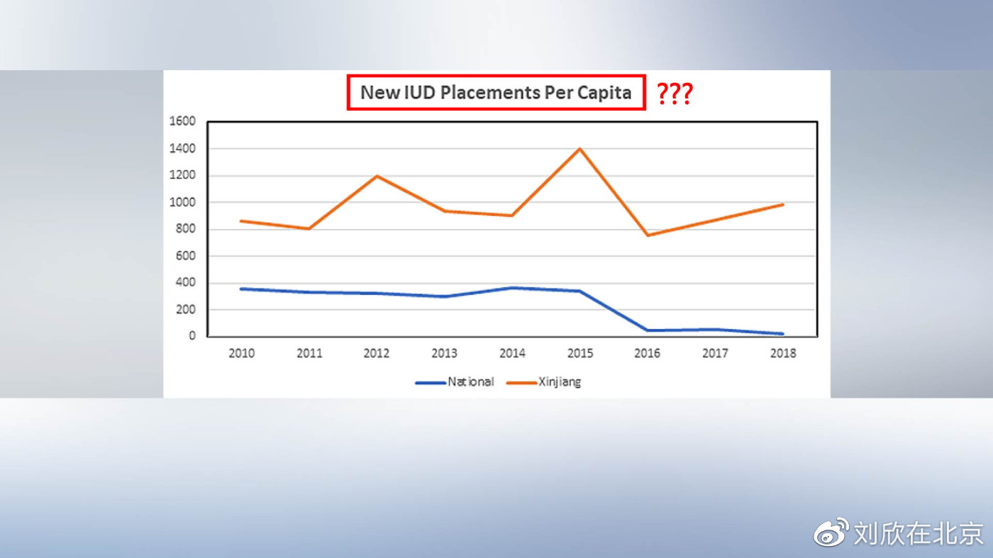但是如果你再深入思考一下就會發現,按照這個計算方法,以河南省為例,“放置節育器凈增長”是20.6萬,占全國的69%。那就意味著新疆占全國80%,河南占全國69%,這兩個加在一起超過了100%。這說不通。鄭國恩用一系列狡詐操作得到了“80”這個頗具煽動性的數據,但是其實他并不能自圓其說。你能看出他的心思:他操縱統計數據,造成從數據上看,好像大部分新疆婦女都被迫甚至強制接受節育手術的假象。