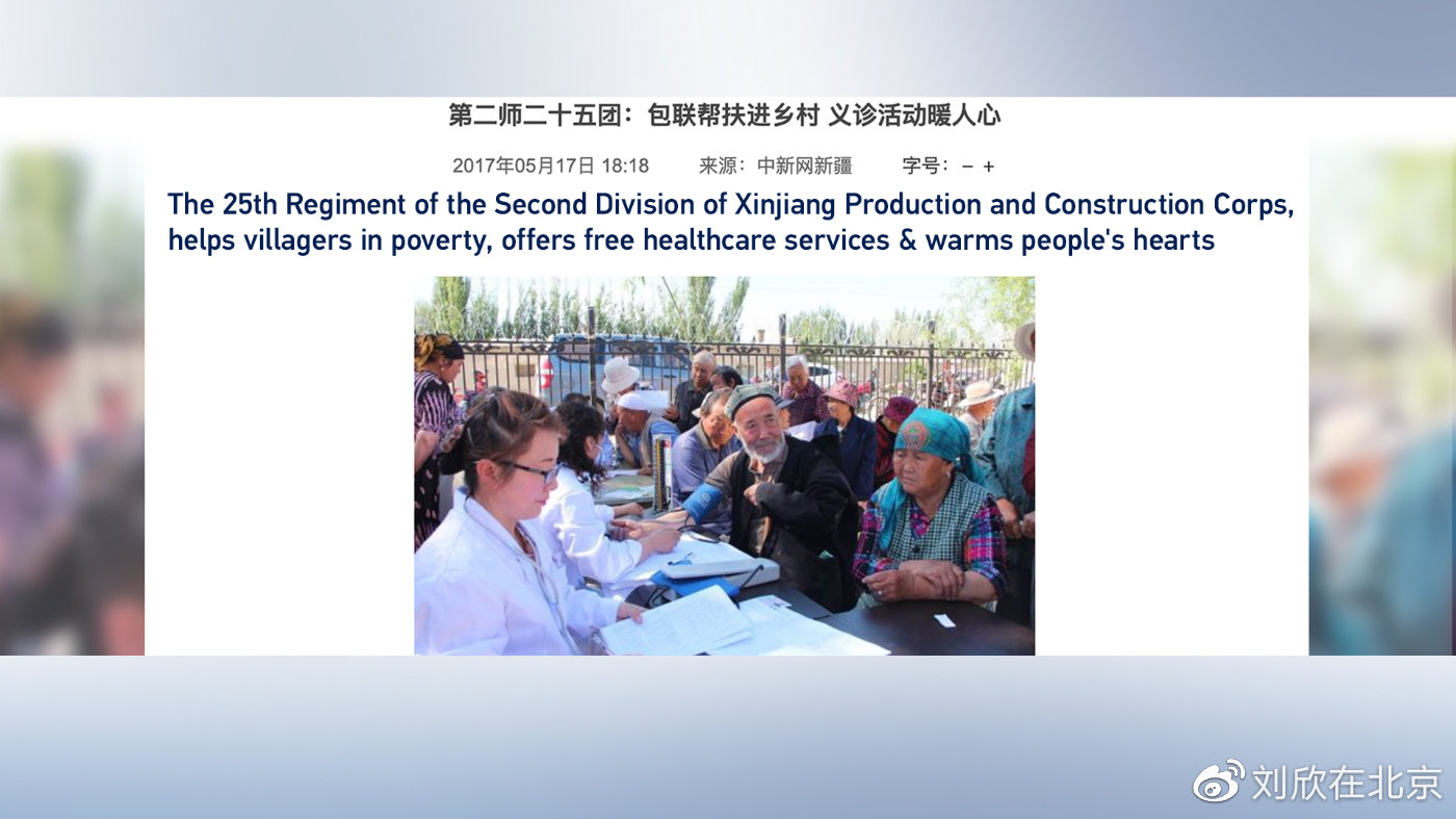 但是,你看一看照片,照片中居于中心位置的人其實都上了年紀,不像是處于育齡的人群。原來這張照片取自一個中國新聞網站,是關于新疆某地的扶貧項目,當地人民免費進行身體檢查和咨詢。這說明了什么問題?有沒有可能由于他不懂漢語,或者他從來沒有去過新疆,所以搞錯了?