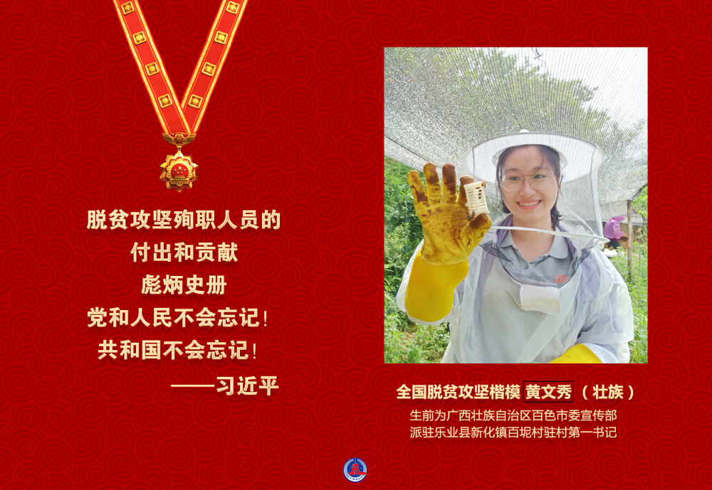 黃文秀同志把青春和熱血都獻(xiàn)給了脫貧攻堅事業(yè),以實際行動詮釋了共產(chǎn)黨人的初心和使命,用短暫而精彩的人生譜寫了一曲新時代共產(chǎn)黨員的奉獻(xiàn)之歌。2019年6月17日犧牲在脫貧攻堅一線,年僅30歲。