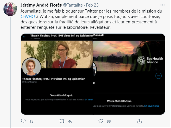 圖為法國《觀點》雜志的反華記者Jérémy André Florès和他在境外社交平臺“推特”上被多名國際病毒專家拉黑的截圖
