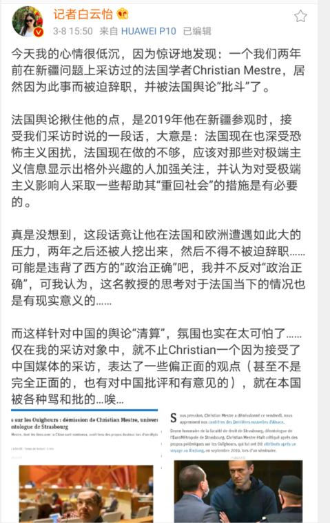另外,這名反華記者還將梅斯特教授此前在斯特拉斯堡大學里推動發展與中國的學術合作,歡迎孔子學院來該校辦學,受邀參加過中國大使館在當地舉行的西藏活動,以及在此次新冠疫情期間發表的肯定中國防疫措施的言行,也都作為了攻擊梅斯特教授的“黑材料”。