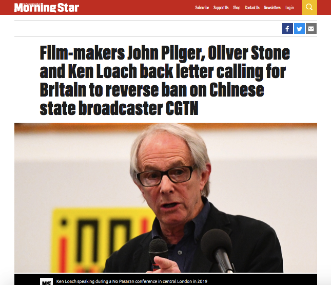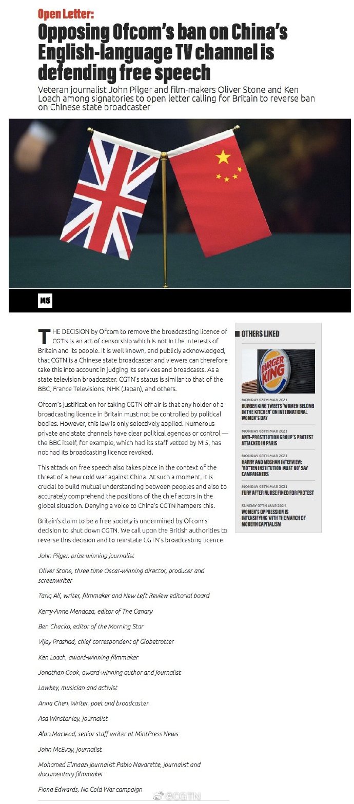 3月9日,多位國際知名人士在英國《晨星報》和“拒絕新冷戰”機構官方網站聯合發表署名公開信,反對英國通訊管理局對中國國際電視臺(CGTN)的禁令。參與此次聯名的包括澳大利亞著名戰地記者、電影導演約翰·皮爾格(John Pilger),三次獲得奧斯卡獎的導演、制片人、編劇奧利佛·斯通(Oliver Stone)以及英國電影學院獎終身成就獎得主肯·洛奇等多位知名人士,包括在英國享有一定聲譽的作家、記者編輯、電影人、音樂人等。