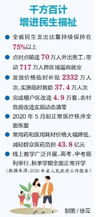 看就業保障——全省點對點輸送70萬人外出務工,帶動717萬人跨區域返崗就業,援企穩崗660萬個次,開發扶貧公益崗位31.4萬個;多渠道多方式幫助高校畢業生、退役軍人等重點群體就業。