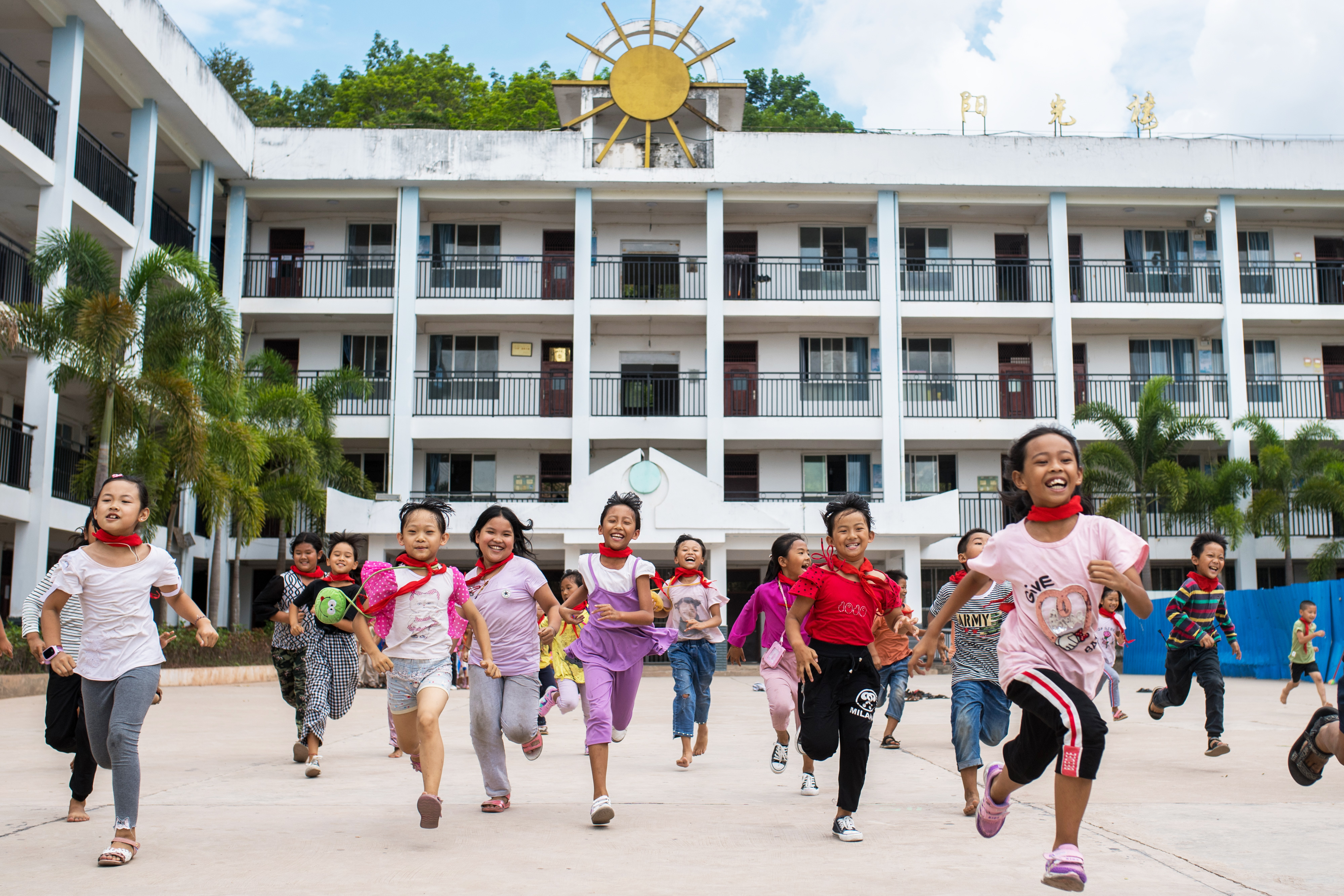 云南西雙版納基諾山基諾族鄉民族小學學生在跑步(2019年6月11日攝)。