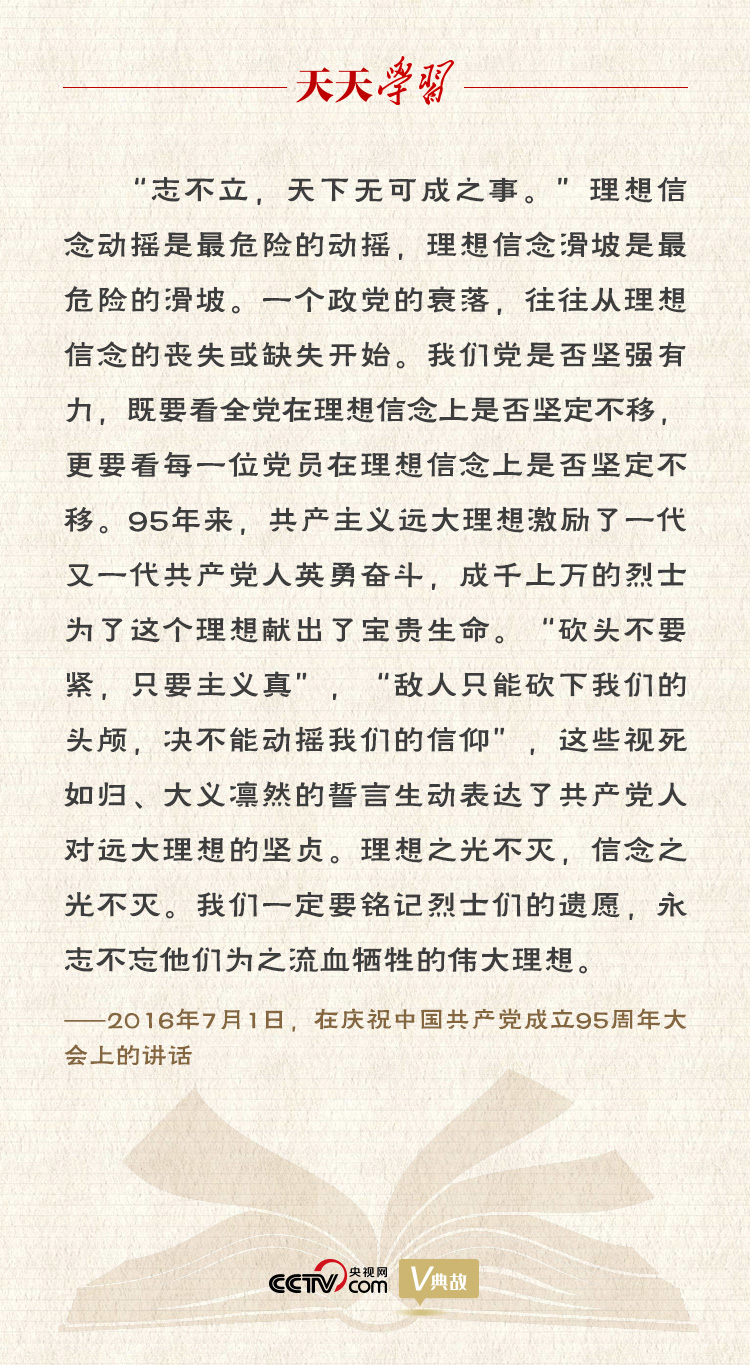 革命理想高于天。回顧黨的百年歷史,沒有一大批具有堅定共產主義理想的中華兒女,就沒有中國共產黨,也就沒有新中國,更沒有今天中國的發展進步。我們要實現中華民族偉大復興的中國夢,同樣離不開理想信念的力量。