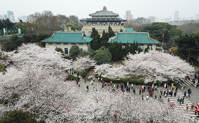 3月13日,來自各地的援鄂醫護人員在武漢大學校園共赴櫻花之約(無人機照片)。