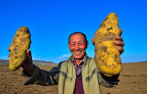 內蒙古烏蘭察布一家馬鈴薯種植與育種公司的種植基地內,基地負責人楊巨才正在展示他剛收獲上來的“最大馬鈴薯”。新華社記者 連振攝